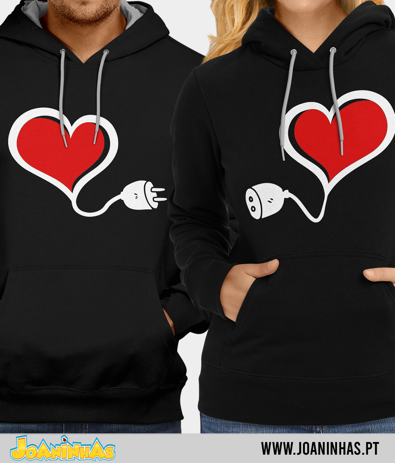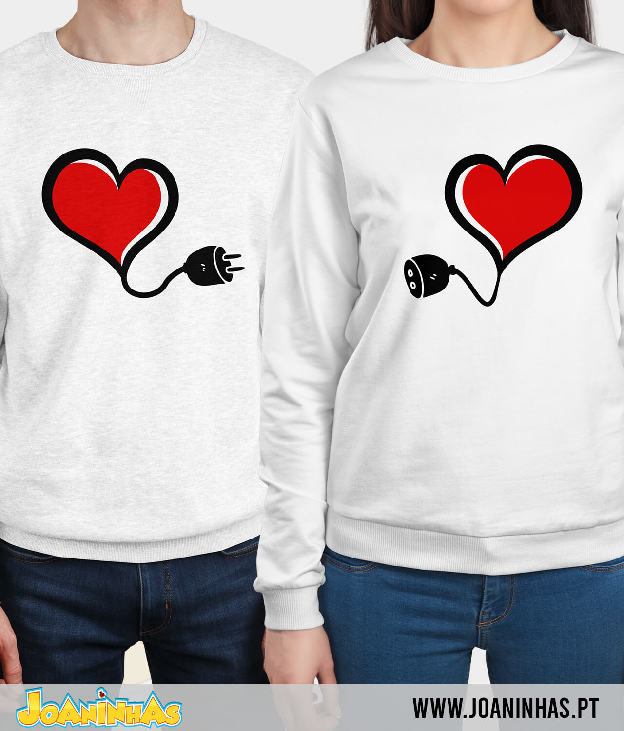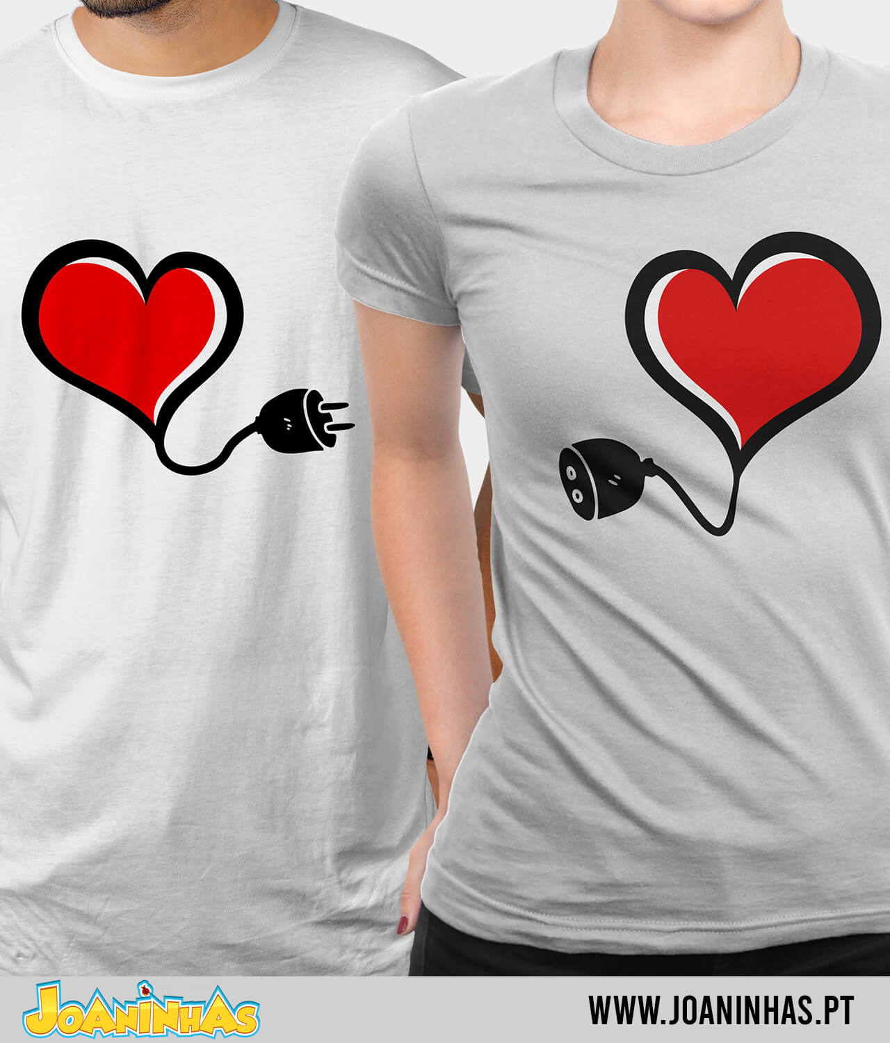 Na T-shirt Amor Eléctrico dele, encontras um coração de onde sai um fio que termina numa ficha elétrica. Já na T-shirt Amor Eléctrico dela, há um coração semelhante, mas com um fio que termina numa tomada, pronta a receber a tal ficha. Imagina caminhar lado a lado, ele “conectado” à T-shirt Amor Eléctrico dela, e toda a gente a olhar, a pensar: “Estes dois estão mesmo em sintonia, não é?” E a verdade? É que estão mesmo — quem precisa de subestações quando o amor está ao rubro?