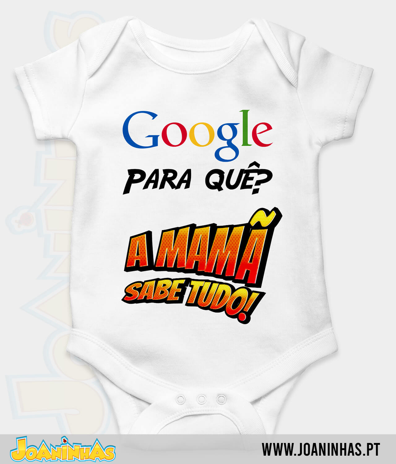 O Bodie Google Mamã festeja a ideia de que a mãe tem respostas para tudo, sem precisar de pesquisar online. A frase “Google para quê? A Mamã sabe tudo!” está dividida em duas linhas: em cima, “Google para quê?” chama a atenção, ao passo que em baixo, em destaque, surge “A Mamã sabe tudo!”, justificando o nome Bodie Google Mamã. Este bodie celebra o conhecimento infinito de quem cuida do bebé 24 horas por dia.