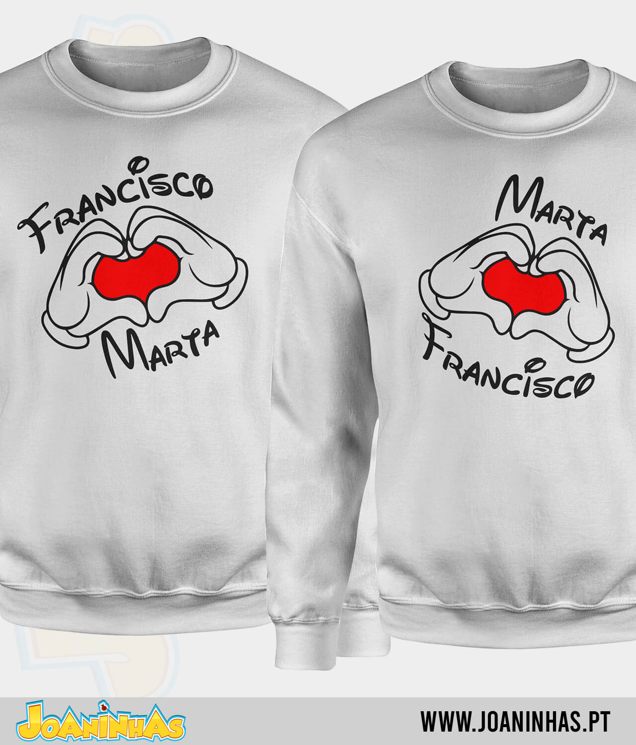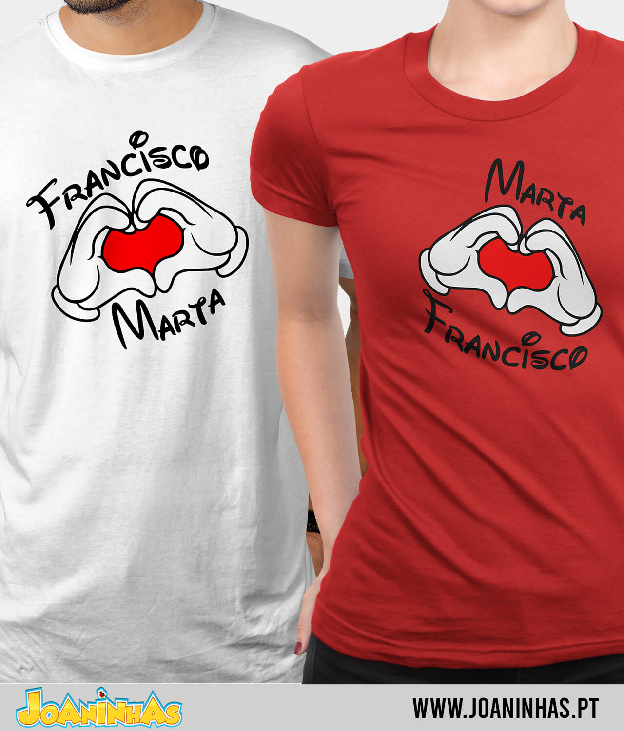 A magia acontece quando as mãos do Mickey se juntam em forma de coração, mas há um toque extra de personalização: o teu nome e o do teu par inseridos de forma harmoniosa no centro. Na T-shirt dele, ficas com a sensação de que o rato está a dizer: “Eis o meu coração, onde o meu nome está guardado, mas o da minha amada também está por perto!” Na dela, o efeito espelhado dá continuidade à brincadeira, mostrando que ambos se completam como num puzzle romântico cheio de orelhinhas.