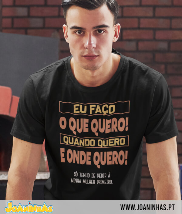 Imagina uma T-shirt com a afirmação altiva “Eu faço o que quero!” em destaque, seguida de “Quando quero” e “E onde quero!” — três linhas que soam a manifesto de independência. Mas, logo abaixo, surge uma pequena nota, quase envergonhada: “Só tenho de pedir à minha mulher primeiro.” Ou seja, a fanfarronice é desmascarada num piscar de olhos, revelando que, no fundo, quem manda é aquela pessoa a quem tens de pedir autorização.
