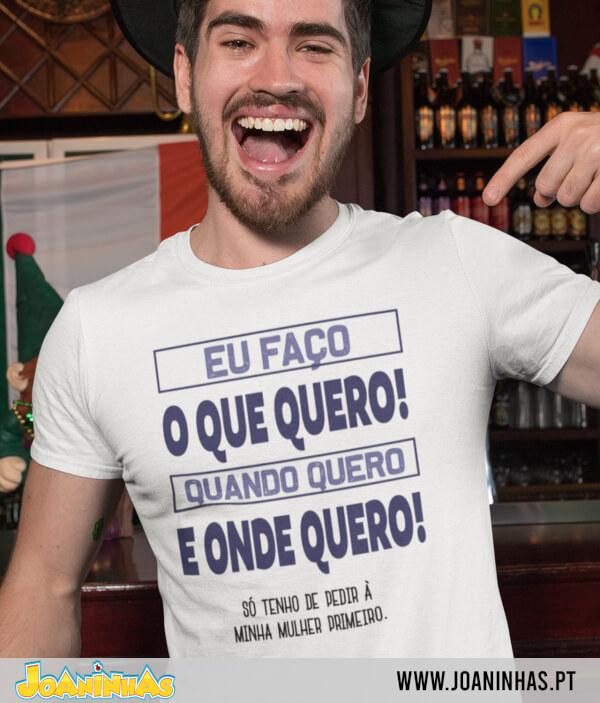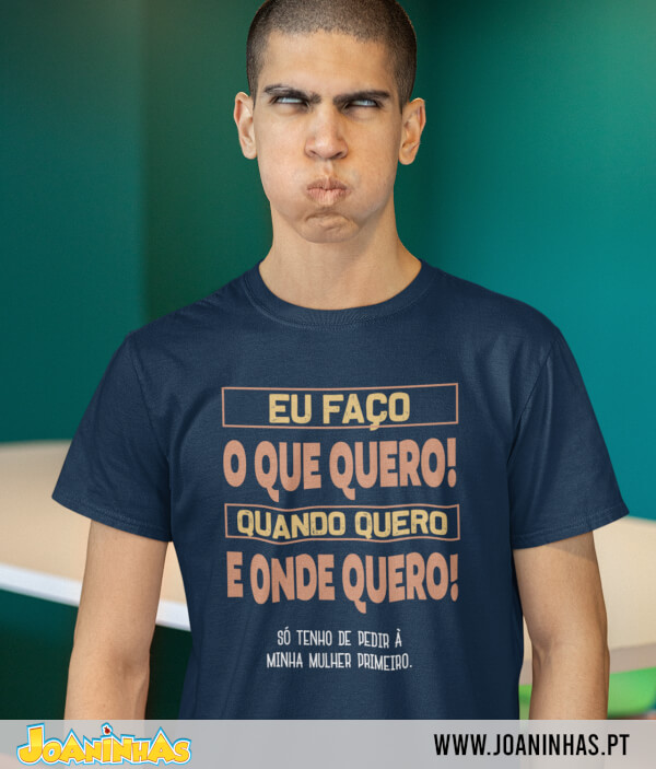 A T-shirt “Eu faço o que quero!” encapsula uma das dinâmicas mais presentes em certos relacionamentos: a fanfarronice masculina (ou feminina, se invertes o papel) que acaba por, num sussurro, admitir que tem de pedir permissão. Esse contraste faz com que o recado seja divertido e francamente honesto, sem ser ofensivo para ninguém.