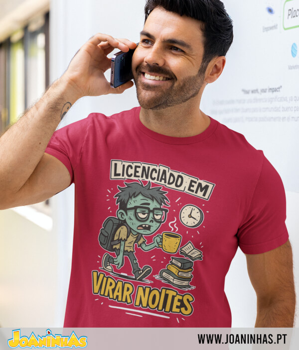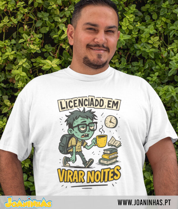 A t-shirt Licenciado em virar noites traz um design divertido e cheio de detalhes: o estudante zumbi, o café sempre na mão, os livros que ninguém sabe como foram lidos e o relógio que marca as horas do desespero. Tudo num grafismo irresistível e disponível num vasto conjunto de cores — porque o estilo nunca descansa, mesmo de madrugada.
