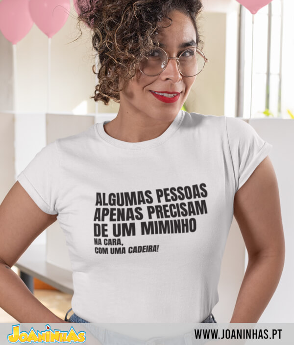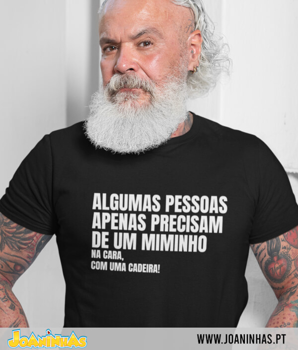 Vivemos rodeados de discursos suaves, de mensagens de “amor e paz,” mas a verdade é que, em certos momentos, a vontade é outra: há indivíduos que nos apetece “afagar” de forma pouco ortodoxa. E é precisamente essa a piada da T-shirt “Miminho na cara!” Em letras grandes, surge a frase “Algumas pessoas precisam apenas de um miminho,” o que até parece fofinho. Só que, logo abaixo, num tamanho discreto, completa-se o pensamento: “Na cara.” E, ainda na linha seguinte, mantendo esse formato minimalista e mordaz, se lê: “com uma cadeira.”