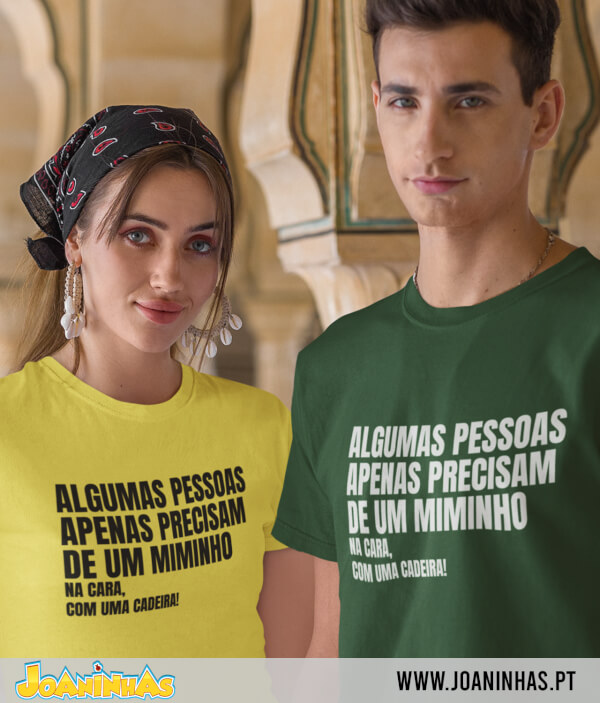 A T-shirt “Miminho na Cara!” pode, numa leitura superficial, remeter à ideia de agredir alguém com uma cadeira. Mas a força da piada vem justamente do contraste: uma frase que começa carinhosa (“Algumas pessoas precisam apenas de um miminho…”) e termina com “na cara, com uma cadeira,” sublinhando o lado ridículo de fantasias de agressão. No fundo, o efeito é cómico, não é um chamado real à violência.
