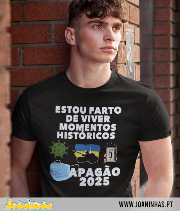 A t-shirt exibe a frase “ESTOU FARTO DE VIVER MOMENTOS HISTÓRICOS” com destaque, acompanhada de ícones gráficos bem familiares: o vírus da COVID-19 com uma máscara cirúrgica, uma bandeira partida da guerra na Ucrânia, e um interruptor desligado com uma vela acesa ao lado tendo no fundo? A cereja no topo do colapso: APAGÃO 2025.