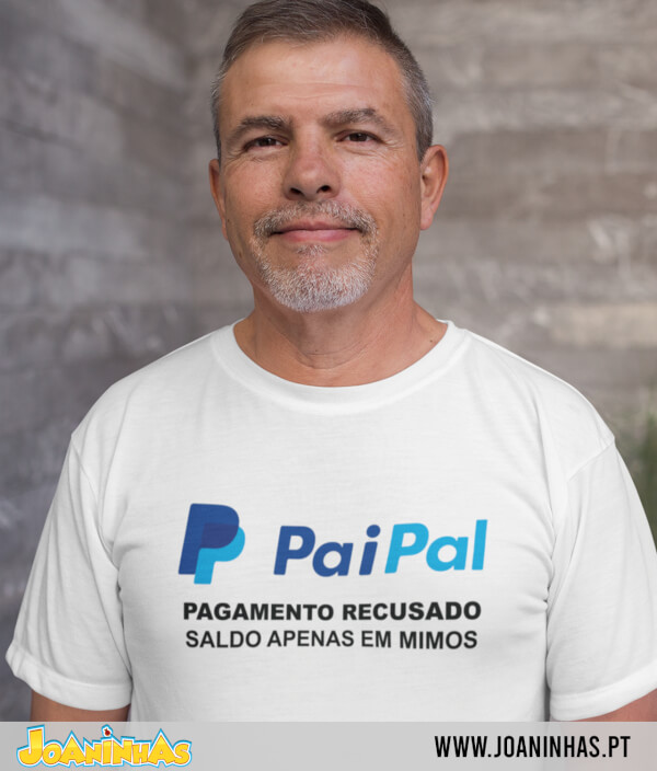 A t-shirt apresenta o logótipo alterado com um toque de génio — PaiPal, num estilo que remete diretamente para a identidade visual da famosa plataforma de pagamentos, mas com uma mensagem bem mais calorosa: