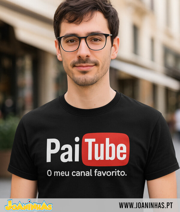 Inspirada no logótipo do YouTube, a palavra PaiTube destaca-se em preto e vermelho, acompanhada da frase “O meu canal favorito.” Mas aqui, em vez de vídeos, há memórias. Em vez de comentários aleatórios, há abraços. E os likes vêm em forma de beijos, gargalhadas e jantares de domingo.