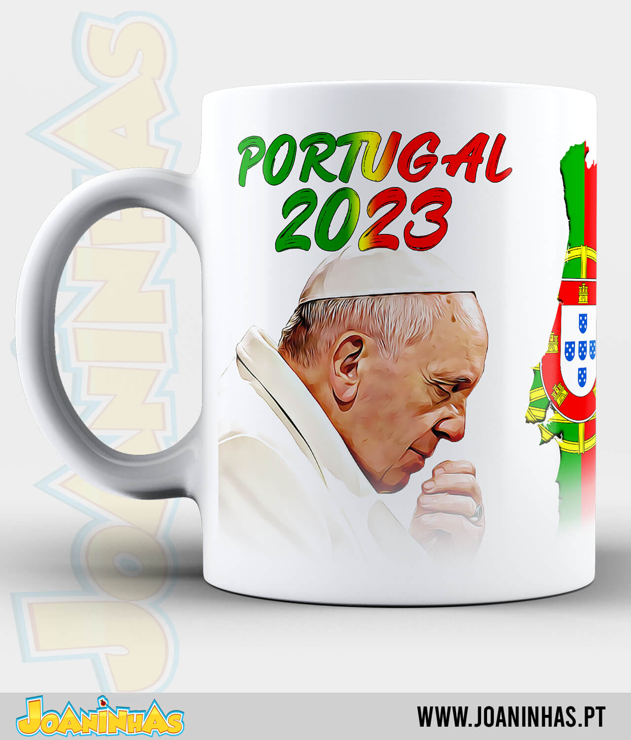 A caneca “Papa Francisco Portugal 2023” apresenta um desenho cativante que combina elementos simbólicos de Portugal com a imagem inspiradora do Papa Francisco. Com cores vivas e detalhes meticulosos, esta caneca é uma lembrança única da visita do Papa ao nosso país.