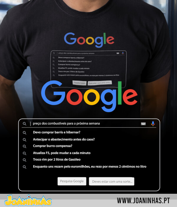 A T-shirt apresenta no centro a clássica caixa de pesquisa do Google, como se estivéssemos a ver o ecrã do computador. Lá dentro, escrito em destaque, encontra-se: “Preço dos combustíveis para a próxima semana” — a frase que todos nós já escrevemos, pelo menos uma vez, quando queremos saber se atestamos agora ou daqui a dois dias.