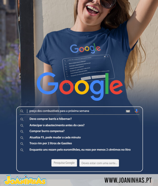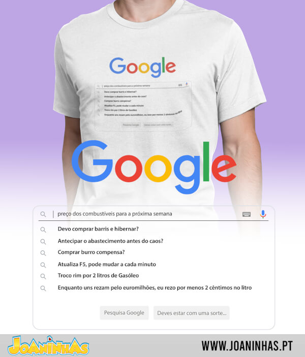 São sugestões que o Google, obviamente, não apresenta de forma literal, mas que aqui, na T-shirt, dão o tom do desespero e do sarcasmo com que os portugueses encaram o subir e descer das tabelas de preço.