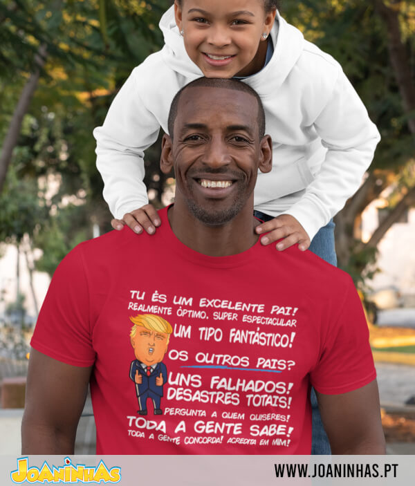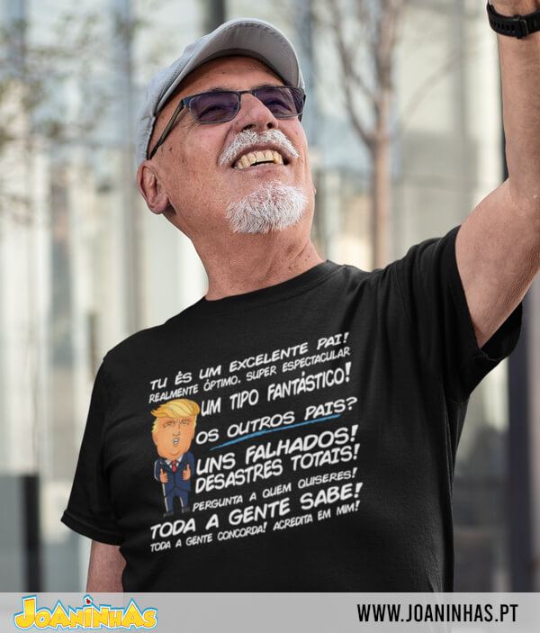 Imagina um caricatura cómica do Donald Trump. Sorriso confiante, cabelo inconfundível, e à sua volta surge um verdadeiro discurso de auto-elogio… mas para o teu pai! A T-shirt “Trump Pai fantástico” inspira-se nessa retórica grandiosa e por vezes disparatada. Afinal, no Dia do Pai (ou no aniversário do teu pai), que melhor presente do que fazê-lo sentir-se o “melhor pai do universo,” com o carimbo de aprovação “trumpeano”?