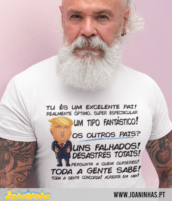 A T-shirt “Trump Pai fantástico” pega na retórica extravagante do ex-presidente e adapta-a para endeusar o teu pai. Frases como “UNS FALHADOS!” ou “DESASTRES TOTAIS!” referindo-se aos outros pais são a cereja no topo do bolo, garantindo gargalhadas a quem lê. E, claro, no fim, fica a sensação de que este é, de facto, um pai grandioso — pelo menos, se acreditarmos no discurso superlativo.